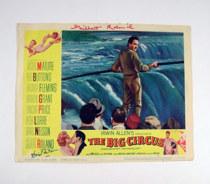 Irwin Allen cut his teeth early on the large-scale all-star cast disaster film genre. One of his earliest efforts was "The Big Circus" in 1959 about a large scale circus who has a saboteur in their midst trying to make sure the show doesn't go on. It culminates in a spectacular high-wire walk across Niagara Falls by aerialist Zach Colino (Gilbert Roland). The cast also included the stars of the day like Victor Mature, Red Buttons, Rhonda Fleming, Vincent Price, Peter Lorre, and the new heart throb: David Nelson. This is an extremely rare original lobby card from the movie and comes with a very rare autograph of Gilbert Roland and that heart-throb David Nelson. Lobby card is 11"x14".