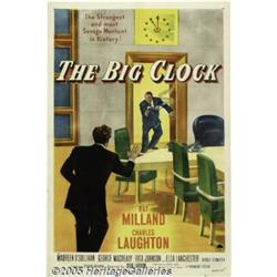 <B>The Big Clock (Paramount, 1948)</B></I> One Sheet (27" X 41"). Ray Milland stars in this suspenseful <I>film noir</B></I> as the editor of a popular true-crime magazine, who is constantly harassed by his demanding tyrant of a publisher, played by Charles Laughton. There is fold line wear with a touch more at the crossfolds, multiple corner and border pinholes, small tears and light creases. The poster has been professionally restored, greatly minimizing these defects. The fantastic graphics of this colorful one sheet perfectly capture the intense drama portrayed in the film. Fine/Very Fine on Linen.