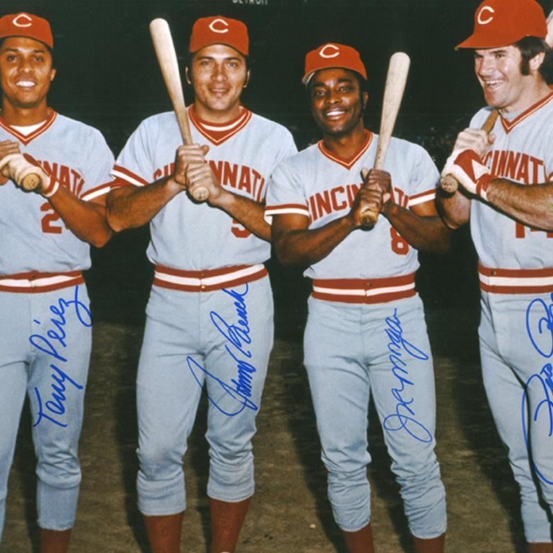 "The Big Four" is a photo featuring signatures from the Big Red Machine's; Johnny Bench (c), Tony Perez (1b), Joe Morgan (2b), Pete Rose (3b). The Reds became the first NL team since the 1921-1922 New York Giants to win consecutive World Series championships. The Big Red Machine of 1975-1976 is considered one of the best teams ever. Measures approx. 16" x 20" (image).
