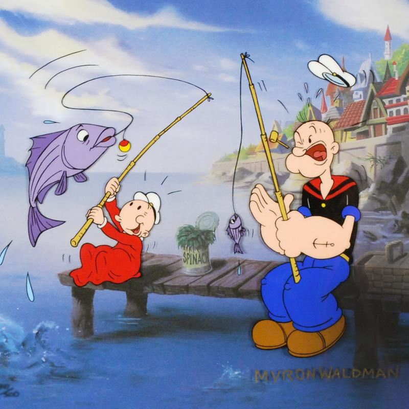 Full of life and color, this piece is a wonderful addition to any room or collection. "The Big One" is a limited edition hand-painted animation cel, numbered and hand-signed by Myron Waldman (1908-2006). Includes Certificate of Authenticity! Measures approx. 14" x 12" (background), 12.5" x 10.5" (cel). The cropping will be needed to properly align the cel and background for framing. The artwork is being auctioned with this in mind.