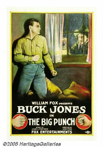 <B>The Big Punch (Fox Film Corporation, 1921).</B></I> One Sheet (27" X 41"). This film was director John Ford's second film for Fox and starred Buck Jones as a divinity student who is wrongfully jailed for a crime committed by his outlaw brother. The borders on this poster have been trimmed and there are several tears and small holes in the graphics. The poster has been professionally restored, greatly minimizing these defects. Good+ on Linen.