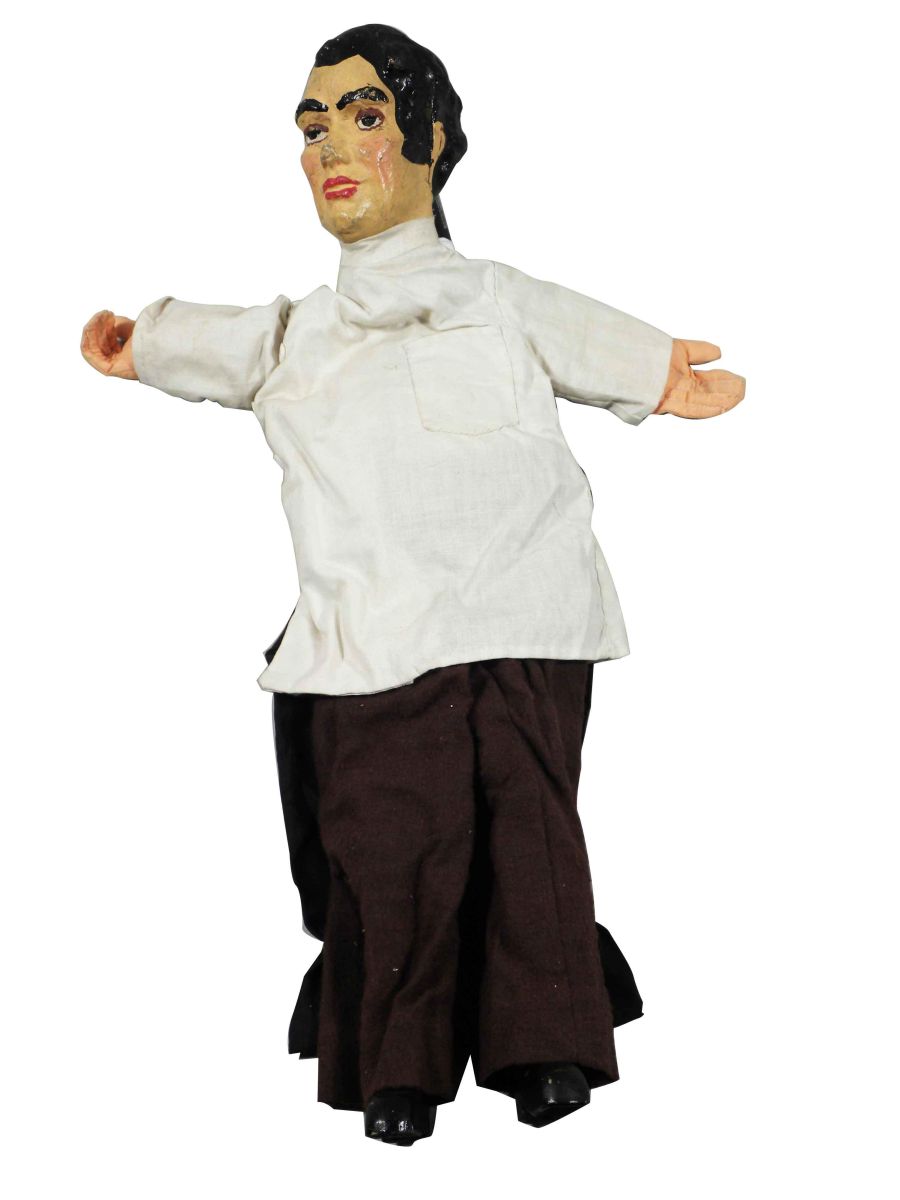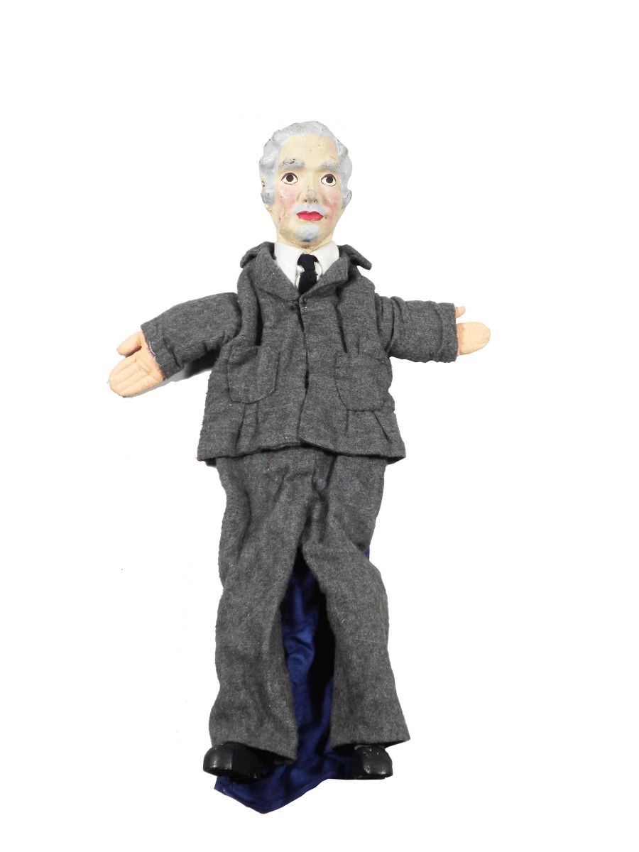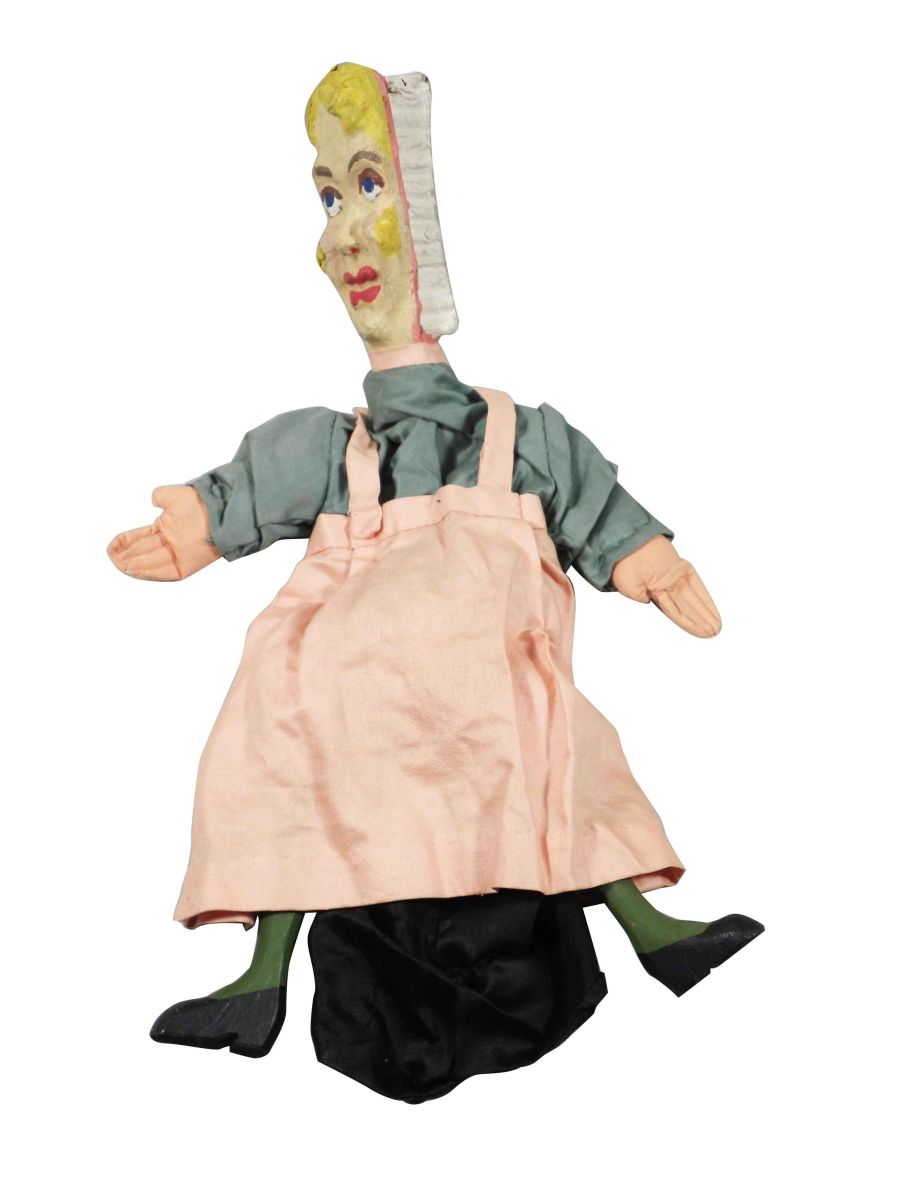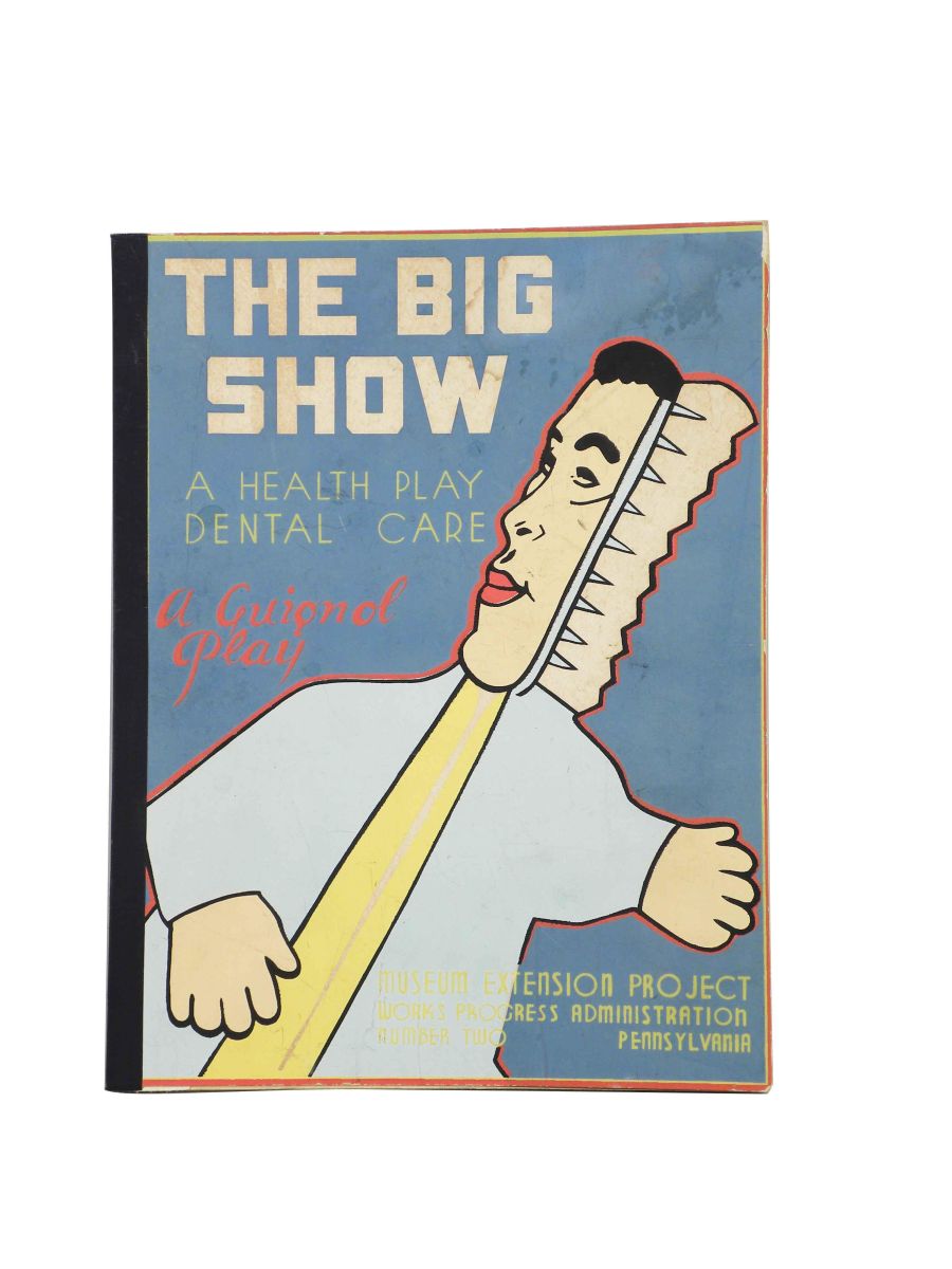 "The Big Show" A Guignol (Hand Puppet) Play in Four Scenes. Museum Extension Project W.P.A. Works Progress Administration, Pennsylvania. Ca. 1930's. A guided play, includes hand puppets, set up instructions and play. Cast of Hand Puppets include School age boy Johnny, Mother, Doctor Fix-it "The Dentist", Two tooth brushes, Two Germs , a Nerve and the Grandfather. Clothing on puppets is sign Marion Rubenstein. Characters are very good to good condition, aprox 21 inches tall.