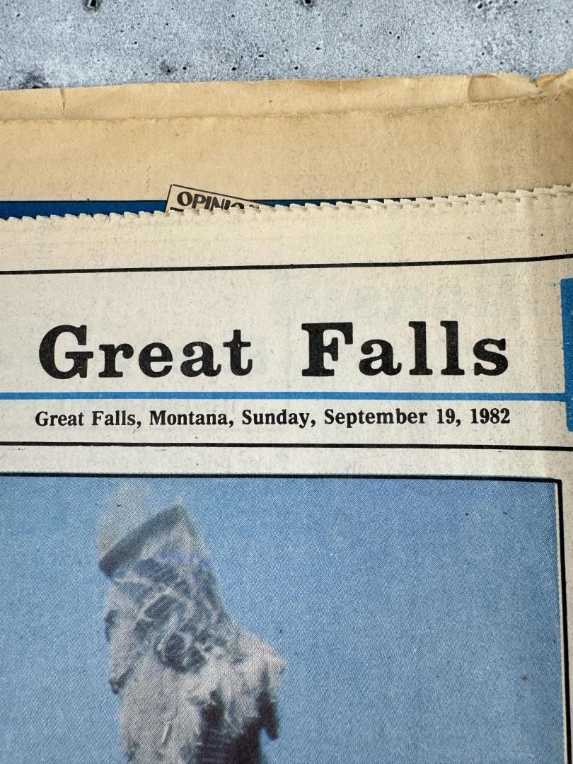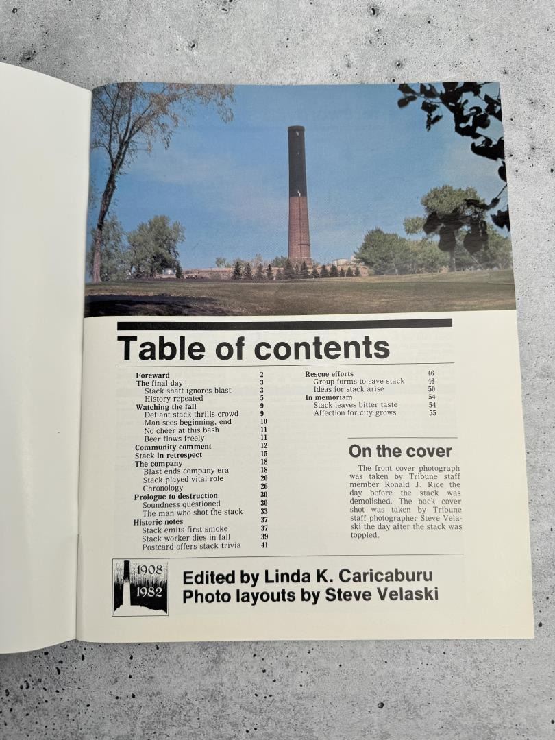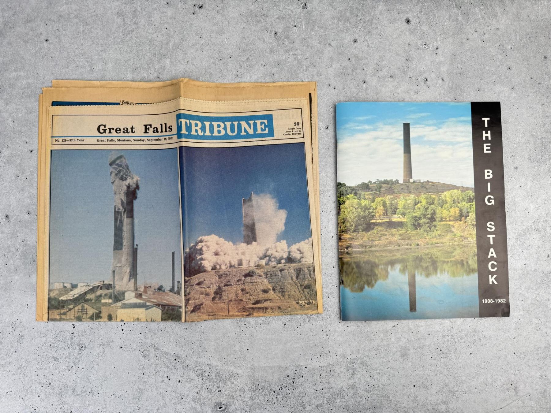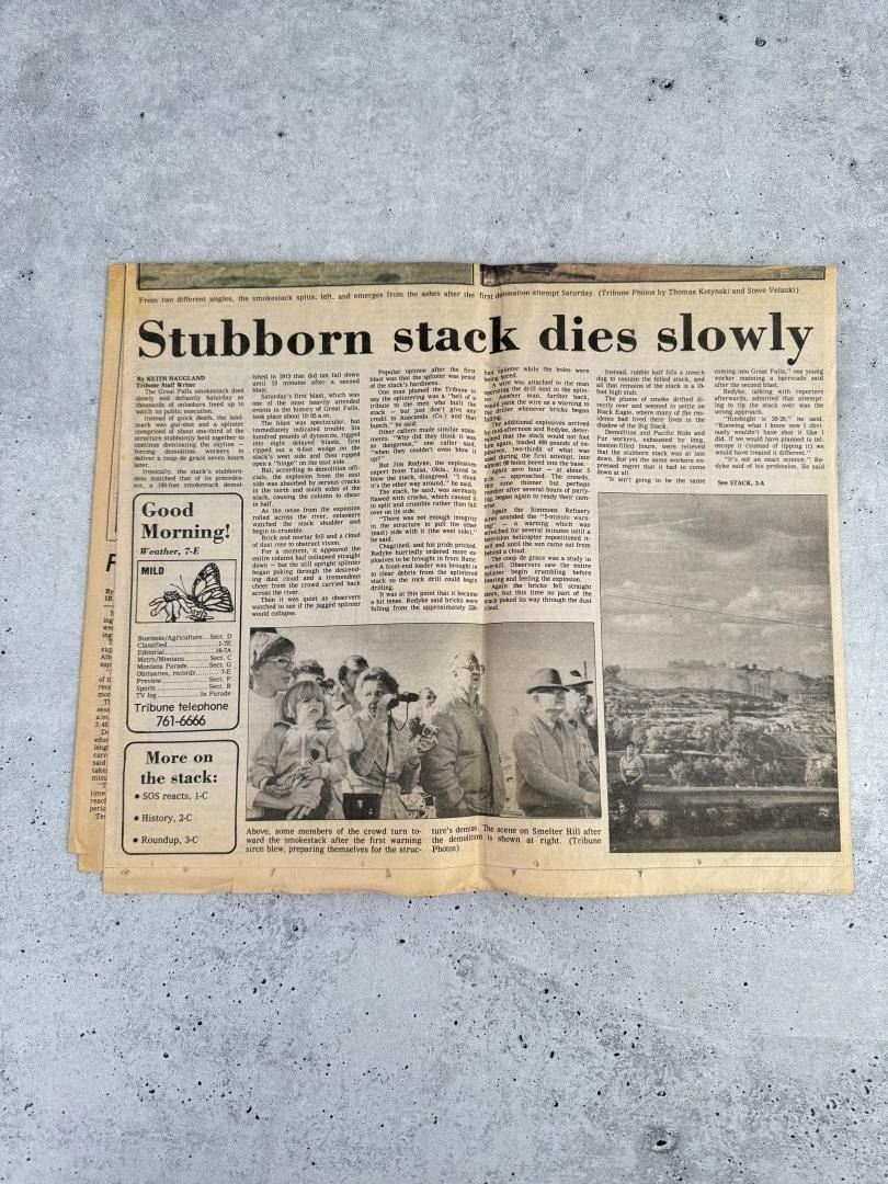 Great Falls Tribune, 1982. Includes a copy of the Tribune covering the demolition of the stack.