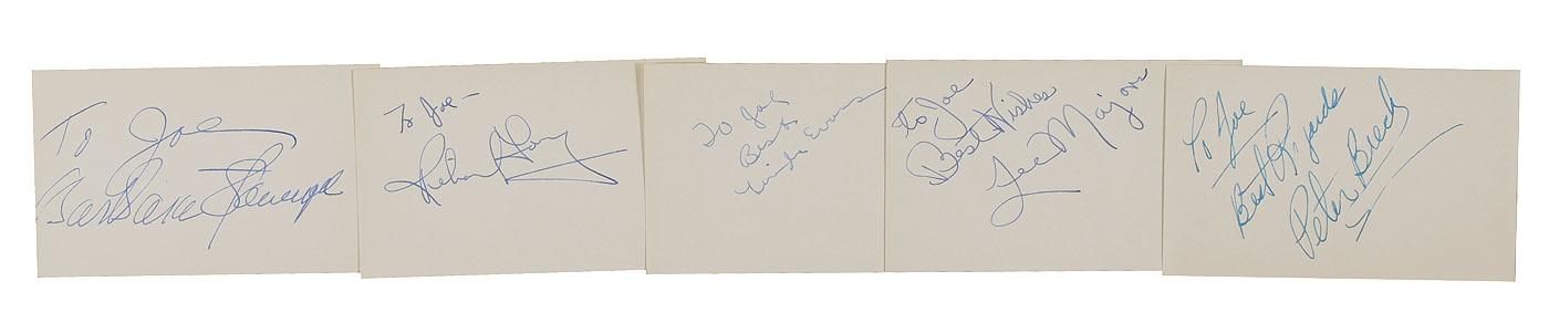 In-person ink signatures and inscriptions of Richard Long, Peter Breck, Lee Majors, Barbara Stanwyck, and Linda Evans on individual off-white 5 x 3 cards. In fine condition. Breck is scarce in any form.