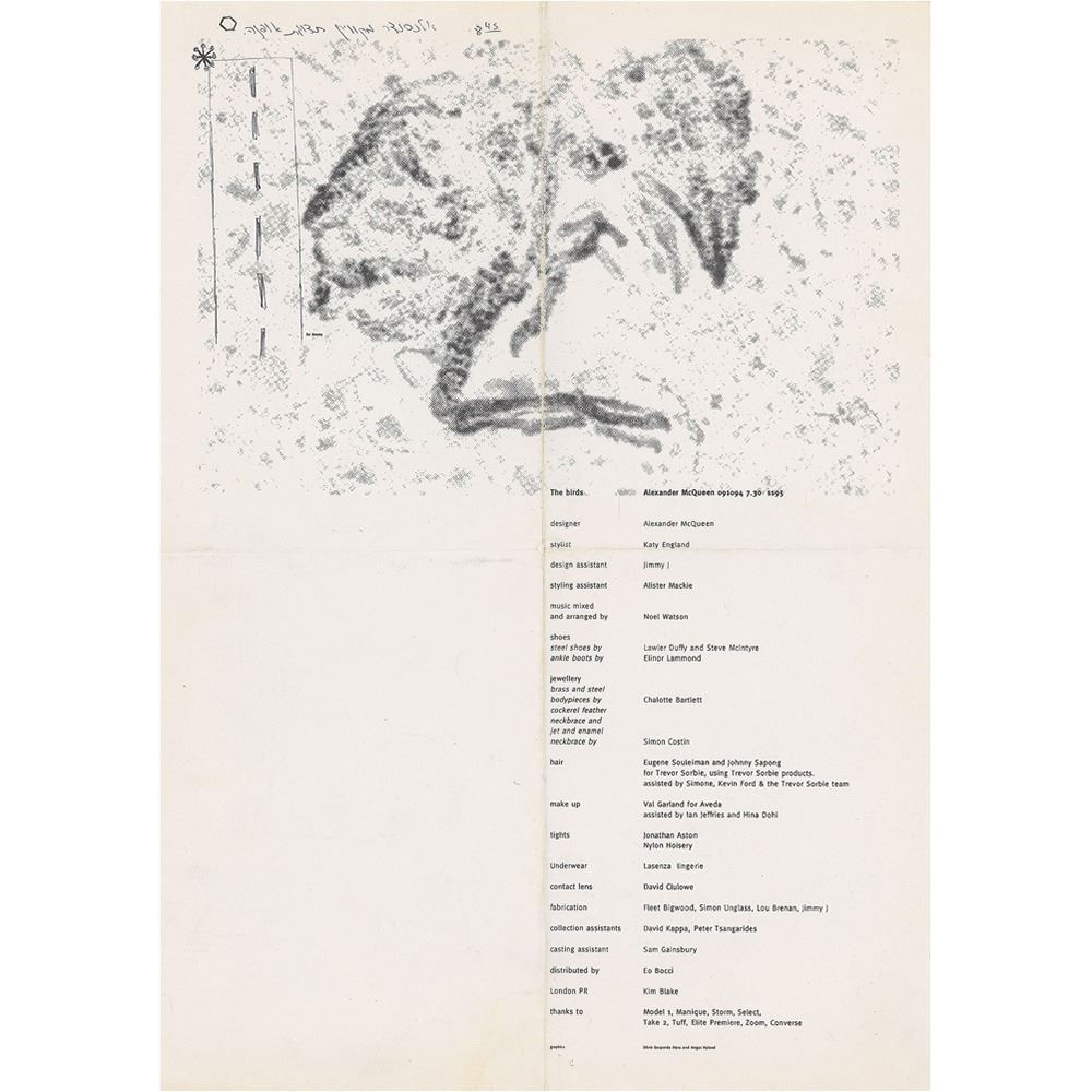 Official invitation for the Alexander McQueen fashion show, ‘The Birds,' staged inside London's Bagley’s Warehouse on September 10, 1994, as part of the designer’s Spring/Summer 1995 collection. The upper portion of the invitation, 8.25? x 11.75?, shows a blurred image of a dead chick in profile, with a credit list running down the right side. Upper left features ballpoint notations in an unknown hand. In fine condition, with central vertical and horizontal folds. McQueen’s S/S 1995 collection, ‘The Birds,’ was the first to feature the avian motif that would soon become a signature of McQueen’s aesthetic, and the highly restrictive, pencil silhouette that characterized the show was inspired by actress Tippi Hedren’s wardrobe in the Alfred Hitchcock film of the same name. Additionally, as he informed the press, the theme of roadkill provided another inspiration for the collection and its staging; designer Simon Costin painted the catwalk to look like a road, and tire-tread prints were controversially marked on the models’ bodies and faces.
