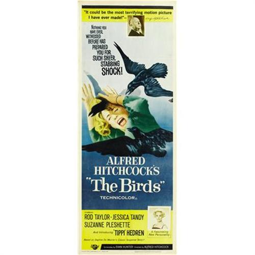 <B>The Birds (Universal, 1963).</B></I> Insert (14" X 36"). By the early 1960s, Alfred Hitchcock was becoming more known for his horror films than those of the rest of his career which relied heavily upon suspense and mystery. "The Birds" solidified that reputation and this insert is a wonderful copy of the best poster on that film. It has one pinhole in each corner and minor color touch to the fold lines. Very Fine+ on Linen. <BR><BR><b>Shipping:</b> Flat Material, Large (<a target="_blank" href="http://www.heritageauctions.com/common/shipping.php">view shipping information</a>)