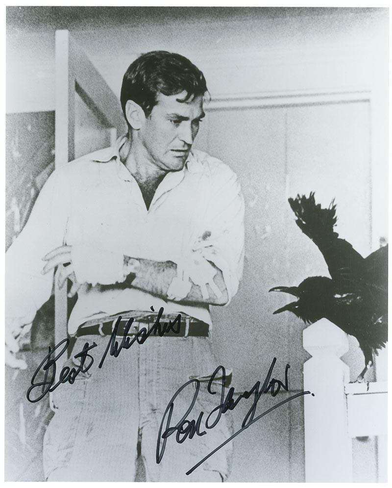 Two signed photos: a color glossy 8 x 10 photo of Tippi Hedren and a feathered friend, signed in black felt tip; and a glossy 8 x 10 photo of Ron Taylor from the film, also signed in black felt tip. In fine condition.