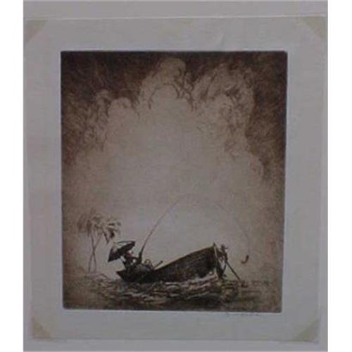 Wimsical etching of a black man enjoying a days fishing. Horace Dentt Welsh, 1888-1942. Image sixe 8 3/4 inches X 7 1/2 inches. Pencil signed lower right. Corner mounts on archival board.
