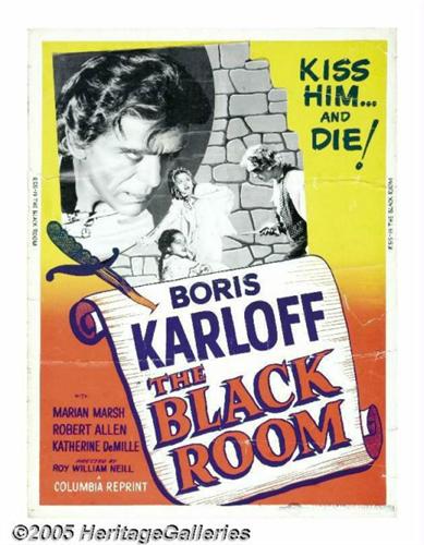 <B>The Black Room (Columbia, R-1955).</B></I> Poster (30" X 40"). Boris Karloff never enjoyed a better showcase for the full range of his acting gifts than this horror thriller. Playing dual roles as twins, Anton and Gregor Bergmann, he is on screen almost constantly as one or both of the brothers. The posters for this film are infamously rare and offered in this lot is the 1955 reissue 30" X 40" on the heavier stock paper. The poster has a 6" U-shaped tear in the right border, extending into the art. There is another large tear in the upper right border of the poster. There are a number of smaller tears around the border and some crimping and wear to the silk-screened image. The photo, all of the castle walls and image of the ladies is a cut out photo paste-up. The rest of the artwork is the silkscreen. Very Good.