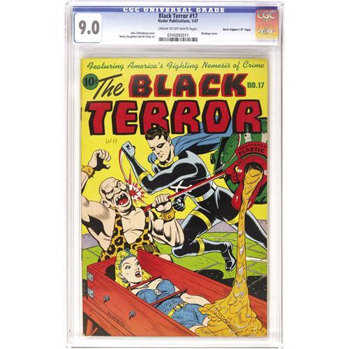 <B>The Black Terror #17 Davis Crippen ("D" Copy) pedigree (Nedor Publications, 1947) CGC VF/NM 9.0 Cream to off-white pages.</B></I> What's the lady on Alex Schomburg's bondage cover about to be encased in? One word: plastics. CGC did the same with this "D" copy, and they also assigned it a high grade that puts it among the finest specimens yet slabbed. Overstreet 2006 VF/NM 9.0 value = $478; NM- 9.2 value = $650. CGC census 6/06: 1 in 9.0, 2 higher. <I>From the Crippen Collection.</B></I> <BR><BR><B>Important notice:</B> Heritage usually auctions material at the rate of 200-250 lots per hour. On some occasions eBay Live bid software or the Internet may not be able to keep up with the pace of the auction. We recommend placing a realistic absentee bid now as insurance to avoid disappointment. Occasionally the auctioneer may eliminate or reject an eBay Live bid, and the auctioneer may also reopen a lot after the close of the eBay live bidding (usually because we missed an audience bid), and may reject your bid even if it shows you as the winning bidder. By bidding via eBay Live, you agree that Heritage may award the lot to another bidder at its sole discretion under the circumstances described above or any other reasonable circumstances. Since eBay bids are not shown to us until we open the lot on the floor, we treat those bids just like floor bids. In most cases the floor responds before the eBay bid is presented to us, due to Internet lag time, so for consistency we have made it a policy that floor bids are always considered first over tie eBay live bids. Also please note that all Heritage lots purchased through eBay Live carry a 22.5% Buyer's Premium. Please make sure you read the Terms and Conditions before you bid. This lot is being auctioned in conjunction with a live floor auction by Heritage Auction Galleries. All final auction and invoice information will be supplied by Heritage Auction Galleries, and all other information should be considered preliminary. Lot:41001 <BR><BR><B>Winning Notification and Billing:</B> After the FINAL session in this auction is complete, Heritage will send e-mail and snail mail invoices. This process normally takes several days. All final auction and invoice information will be supplied by Heritage Auction Galleries, and all other information should be considered preliminary. <BR><BR>This auction will be conducted on a live auction floor and over the Internet through eBay Live. If you choose to place an absentee bid, please take a moment to <font color='#0000ff'><u><a href='http://pages.ebay.com/liveauctions/help/before/laabsentee.html'>learn how eBay Live absentee bidding works</a></u></font><font color='#000000'>