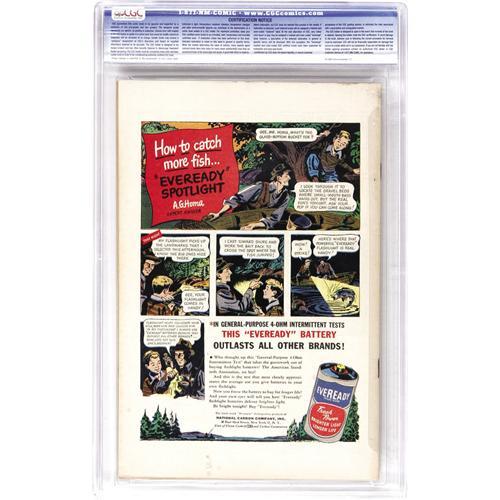 <B>The Black Terror #24 Double Cover - Davis Crippen ("D" Copy) pedigree (Nedor Publications, 1948) CGC VF+ 8.5 Cream to off-white pages.</B></I> Frank Frazetta put pen to paper for a panel in this issue, while a more obvious contribution came from Alex Schomburg, who drew the bondage cover. The ingenue here is one of the sexier ladies Schomburg ever drew! Note that a small plastic stabilizing peg is loose inside the CGC holder, not affecting the comic itself or the integrity of the holder. CGC notes, "1st cover 6.5, interior cover 8.5." Overstreet 2006 VF 8.0 value = $275; VF/NM 9.0 value = $430. CGC census 6/06: 1 in 8.5, 1 higher. <I>From the Crippen Collection.</B></I> <BR><BR><B>Important notice:</B> Heritage usually auctions material at the rate of 200-250 lots per hour. On some occasions eBay Live bid software or the Internet may not be able to keep up with the pace of the auction. We recommend placing a realistic absentee bid now as insurance to avoid disappointment. Occasionally the auctioneer may eliminate or reject an eBay Live bid, and the auctioneer may also reopen a lot after the close of the eBay live bidding (usually because we missed an audience bid), and may reject your bid even if it shows you as the winning bidder. By bidding via eBay Live, you agree that Heritage may award the lot to another bidder at its sole discretion under the circumstances described above or any other reasonable circumstances. Since eBay bids are not shown to us until we open the lot on the floor, we treat those bids just like floor bids. In most cases the floor responds before the eBay bid is presented to us, due to Internet lag time, so for consistency we have made it a policy that floor bids are always considered first over tie eBay live bids. Also please note that all Heritage lots purchased through eBay Live carry a 22.5% Buyer's Premium. Please make sure you read the Terms and Conditions before you bid. This lot is being auctioned in conjunction with a live floor auction by Heritage Auction Galleries. All final auction and invoice information will be supplied by Heritage Auction Galleries, and all other information should be considered preliminary. Lot:41001 <BR><BR><B>Winning Notification and Billing:</B> After the FINAL session in this auction is complete, Heritage will send e-mail and snail mail invoices. This process normally takes several days. All final auction and invoice information will be supplied by Heritage Auction Galleries, and all other information should be considered preliminary. <BR><BR>This auction will be conducted on a live auction floor and over the Internet through eBay Live. If you choose to place an absentee bid, please take a moment to <font color='#0000ff'><u><a href='http://pages.ebay.com/liveauctions/help/before/laabsentee.html'>learn how eBay Live absentee bidding works</a></u></font><font color='#000000'>