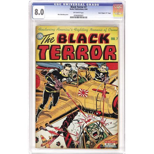 <B>The Black Terror #7 Davis Crippen ("D" Copy) pedigree (Nedor Publications, 1944) CGC VF 8.0 Off-white pages.</B></I> Alex Schomburg rendered this hard-hitting Japanese war scene featuring the Black Terror and Tim. Overstreet 2006 VF 8.0 value = $356. CGC census 6/06: 1 in 8.0, none higher. <I>From the Crippen Collection.</B></I> <BR><BR><B>Important notice:</B> Heritage usually auctions material at the rate of 200-250 lots per hour. On some occasions eBay Live bid software or the Internet may not be able to keep up with the pace of the auction. We recommend placing a realistic absentee bid now as insurance to avoid disappointment. Occasionally the auctioneer may eliminate or reject an eBay Live bid, and the auctioneer may also reopen a lot after the close of the eBay live bidding (usually because we missed an audience bid), and may reject your bid even if it shows you as the winning bidder. By bidding via eBay Live, you agree that Heritage may award the lot to another bidder at its sole discretion under the circumstances described above or any other reasonable circumstances. Since eBay bids are not shown to us until we open the lot on the floor, we treat those bids just like floor bids. In most cases the floor responds before the eBay bid is presented to us, due to Internet lag time, so for consistency we have made it a policy that floor bids are always considered first over tie eBay live bids. Also please note that all Heritage lots purchased through eBay Live carry a 22.5% Buyer's Premium. Please make sure you read the Terms and Conditions before you bid. This lot is being auctioned in conjunction with a live floor auction by Heritage Auction Galleries. All final auction and invoice information will be supplied by Heritage Auction Galleries, and all other information should be considered preliminary. Lot:41001 <BR><BR><B>Winning Notification and Billing:</B> After the FINAL session in this auction is complete, Heritage will send e-mail and snail mail invoices. This process normally takes several days. All final auction and invoice information will be supplied by Heritage Auction Galleries, and all other information should be considered preliminary. <BR><BR>This auction will be conducted on a live auction floor and over the Internet through eBay Live. If you choose to place an absentee bid, please take a moment to <font color='#0000ff'><u><a href='http://pages.ebay.com/liveauctions/help/before/laabsentee.html'>learn how eBay Live absentee bidding works</a></u></font><font color='#000000'>