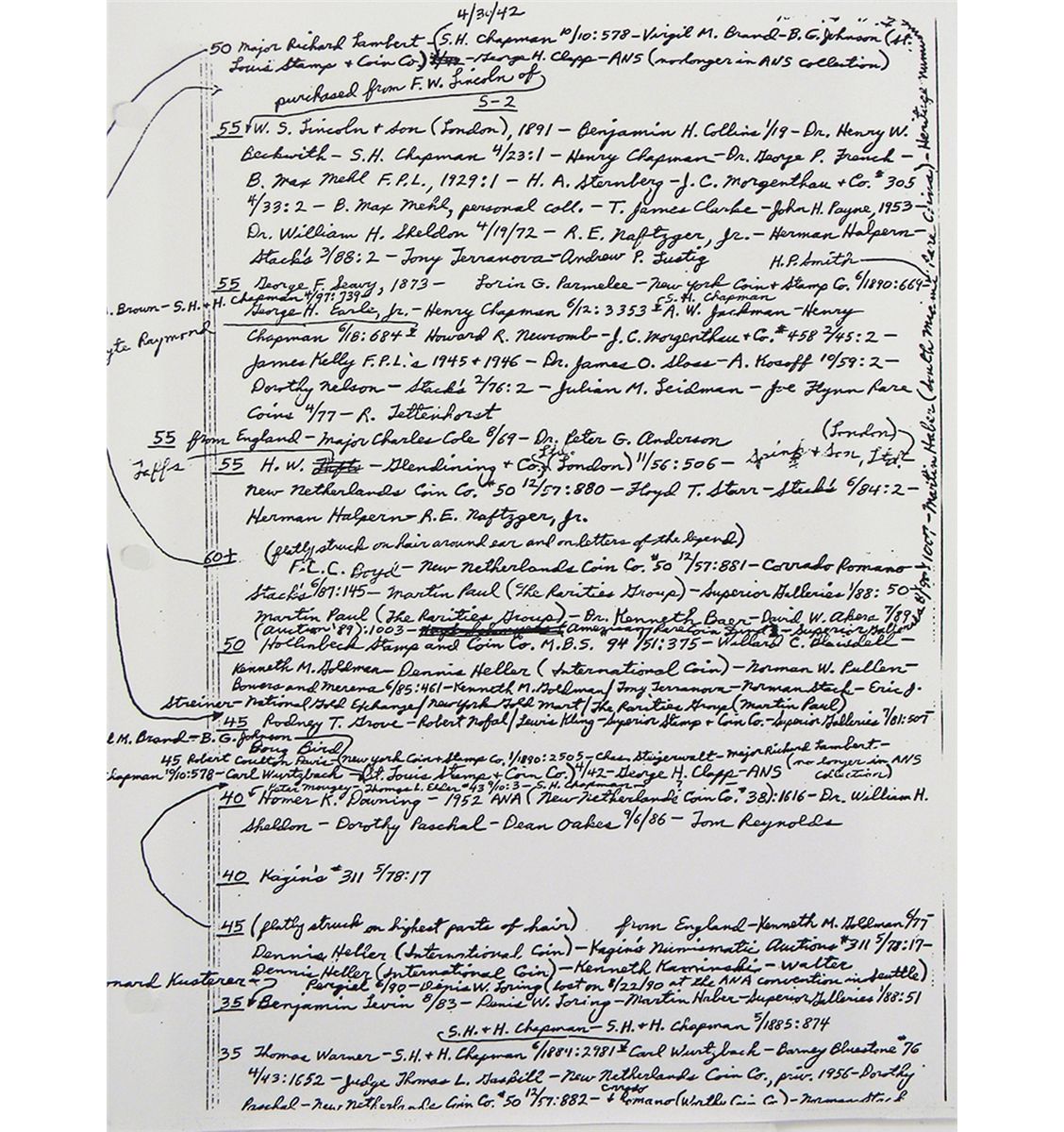 Bland, Del. CONDITION CENSUS OF EARLY DATE UNITED STATES LARGE CENTS. Circa 1992. Photocopies. Approximately 450 sheets of ruled paper written on one side, covering all 295 Sheldon varieties, the sub-varieties and all of the NCs. Held in two three-ring binders. Near fine. Most interesting. Though obviously no longer up to date, these full versions of the condition census include information that rarely appears in print, if only for reasons of space limitations. Bland's photocopied notes received very limited circulation.