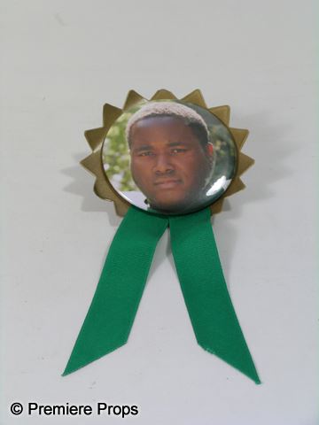 Leigh Anne Tuohy (Sandra Bullock) Michael Oher button with green ribbon and gold trim (approx. 2 7/8"D)