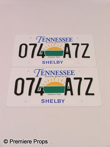 Two white with blue 'Tennessee' and 'Shelby,' black '074 A7Z' and sunshine design, licenses plates. (approx. 12" x 6" each)
