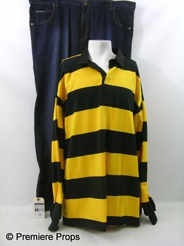 Michael Oher's (Quinton Aaron) screen worn navy with orange horizontal stripes and long sleeve, with buttons at collar "Barbarian" rugby shirt, (size 5XL) and dark blue denim five pocket "Grey Stone" jeans. (Size 52x34) Includes wardrobe tag!