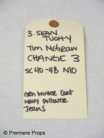 The Blind Side - This is Sean Tuohy's (Tim McGraw) screen worn costume. Included is a white s/s crew neck "Banana Republic" t-shirt (no size, velcro on back at neck) dark blue l/s zipper at collar "Elie Tahari" sweatshirt (size M), and brown l/s zip front with four pockets on front "Ralph Lauren" coat (Size L) (Size 34x32). This costume comes complete with the wardrobe department tag! (TBS1047)