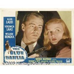 <B>The Blue Dahlia (Paramount, 1946)</B></I> Lobby Card (11" X 14"). An absolutely gorgeous portrait card of Alan Ladd and Veronica Lake! With dramatic, upward lighting, this shot captures the epitome of noir style. Johnny Morrison (Ladd) comes back from the war to discover that his wife (Doris Dowling) has caused their son's death in a drunken accident, as well as being constantly unfaithful. After a huge argument with her, he leaves. When she is later murdered with his gun, Morrison becomes suspect number one. Joyce Harwood (Lake) helps him to prove his innocence. Pinholes, one small stain on Ladd's collar and several small border stains. Otherwise, a beautiful clean card. Very Fine+.