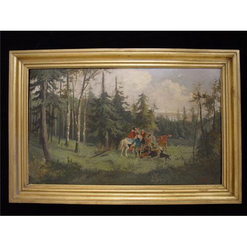 Very old oil painting of a boar hunt, with red-jacketed hunters on horses accompanied by dogs in a forest of tall pines. Please ask questions, request additional photos and shipping costs prior to bidding. <p>Measurements: Canvas: 26 3/4" wide by 16 1/4" high; Frame: 31" wide by 20 1/2" tall. (Item #017)