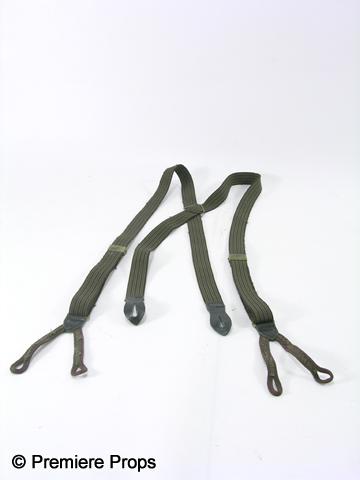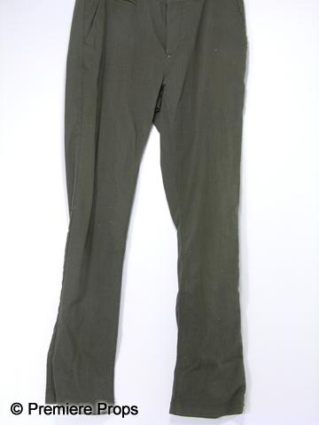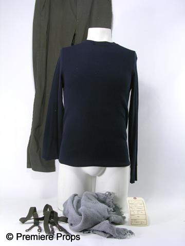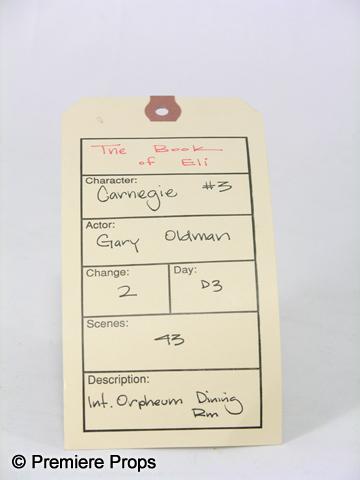 The Book of Eli - Direct from the set of the adventure thriller, The Book of Eli, this is Carnegie's (Gary Oldman) screen worn, hero, black "Gap" long sleeve crewneck thermal, (Size S) brown "Converse John Varvatos" pinstripe pants, (Size 32x32) brown and green vertical stripe suspenders with brass and leather fittins, (No size) and gray burlap scarf with holes and torn edges. (approx 50" x 30") Includes wardrobe tag! (BOE1082)