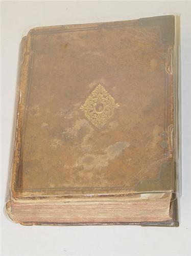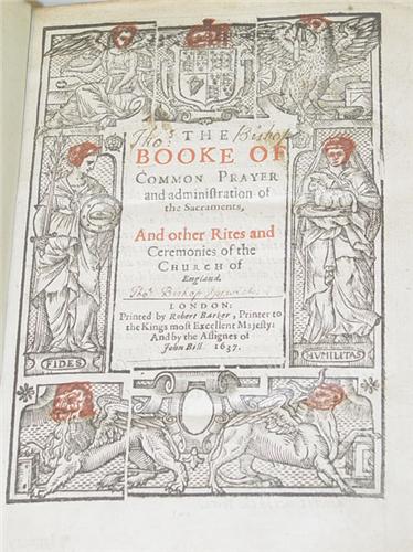 The Booke of Common Prayer and Administration of the Sacraments, and Other Rites and Ceremonies of the Church of England - 3 Books in One. 12mo - over 6¾" - 7¾" tall. Hard Cover. Ex-Library. Covers in Fair Condition, Interior in Very Good Condition. Bound in leather with gilt stamped emblem on both covers, 4 etched brass cornerpieces, 2 brass clasp catches on back (lacks leather clasps), flourished initials throughout. ***The Booke of Common Prayer....(1637) London: Printed by Robert Barker & John Bill. Title page in red & black ink, in an illustrated, colored woodcut border, calendar in red & black ink. Owners name on title page "Tho.s Bishop Ipswick". ***The Psalter or Psalmes of David, After the Translation of the Great Bible, Pointed as it Shall be Sung or Said in Churches (1637) London: Printed by Robert Barker, John Bill. Title with illustrated woodcut border, black ink. ***The Whole Booke of Psalmes: Collected into English Meeter by Thomas Sternhold & John Hopkins and others. Conferred With the Hebrew with Apt Notes to Sing them Withall. James V. (1635) London: Printed by T.P. Title in black illustrated woodcut border. Includes musical notation. Front cover nearly detached, backstrip loose, with upper/lower loss. Binding holding, in a protective mylar jacket.