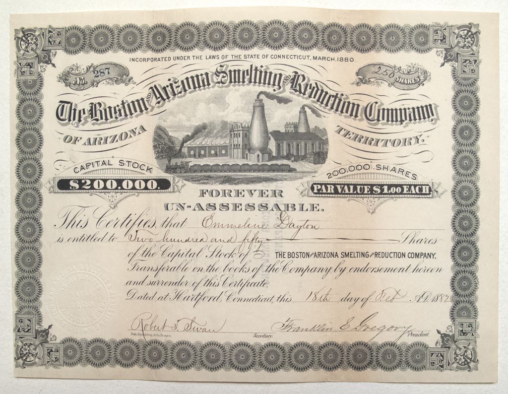 Number 287 for 250 shares to Emmeline Dayton. Signed by secretary Swan and president Gregory.