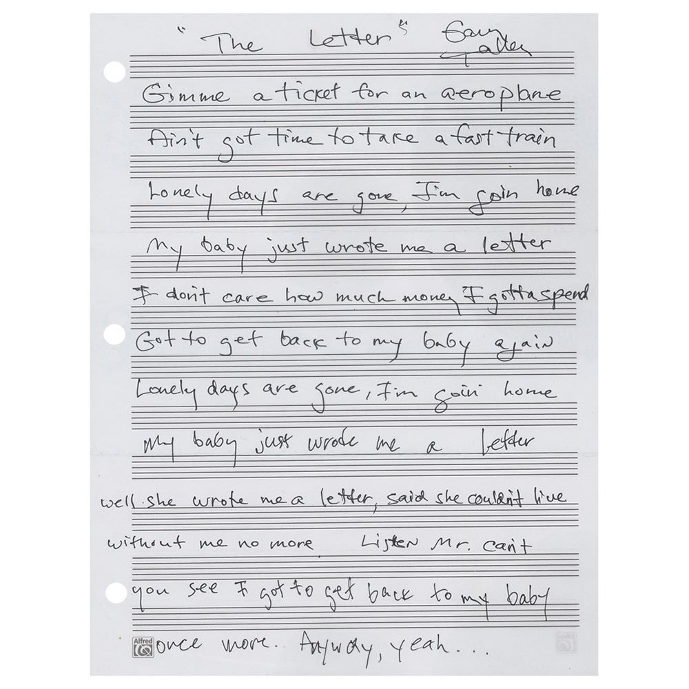 Handwritten lyrics for 'The Letter,' the 1967 hit single by The Box Tops, penned in black ink by Garry Talley on an off-white 8.5 x 11 musically lined sheet, with Talley signing in the upper border. The lyrics, in full: "Gimme a ticket for an aeroplane / Ain't got time to take a fast train / Lonely days are gone, I'm goin home / My baby just wrote me a letter / I don't care how much money I gotta spend / Got to get back to my baby again / Lonely days are gone, I'm goin home / My baby just wrote me a letter / Well she wrote me a letter, said she couldn't live / without me no more, Listen Mr., can't / you see I got to get back to my baby / once more, Anyway, yeah…" In fine condition, with binder holes to left border.