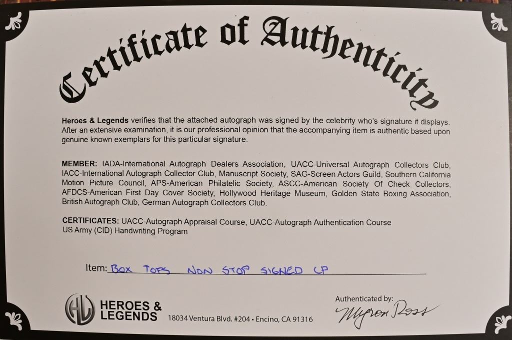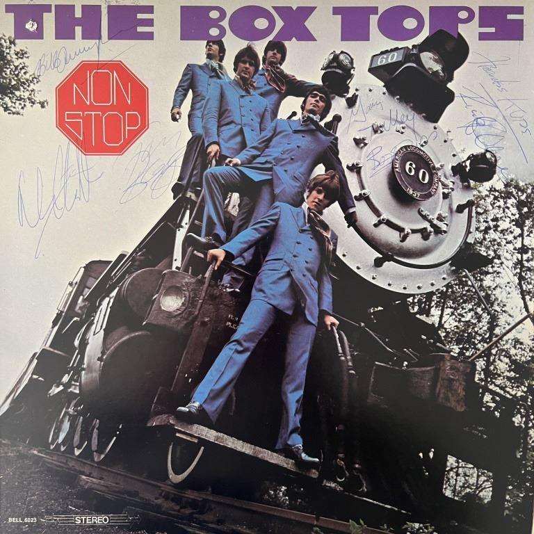 The Box Tops Non Stop signed album autographed by Bill Cunningham, Alex Chilton, Gary Talley, Thomas Boggs and Rick Allen. 12x12 inches vinyl included. DB479