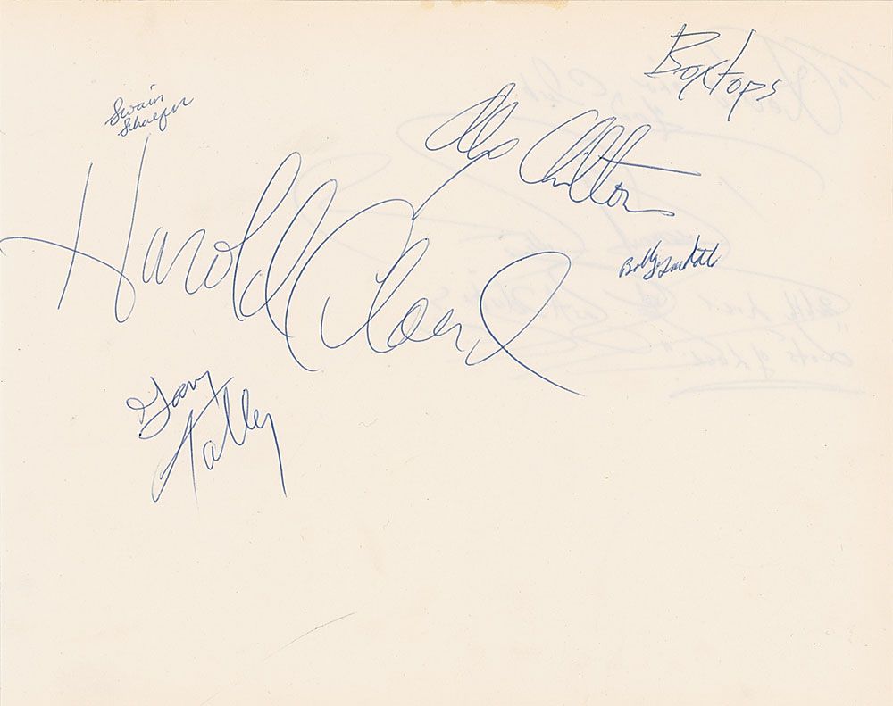 Ballpoint signatures of Harold Cloud, Swain Schaefer, Gary Talley, Bobby Guidotti, and Alex Chilton on a 9.5 x 7.5 off-white sheet. In fine condition.