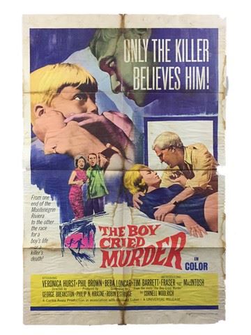 The Boy Cried Murder (Universal Pictures, 1966). One Sheet. Starring: Fraser MacIntosh and Veronica Hurst. There are fold lines, marks, pin holes, paper loss, stains and edge wear damage. Poor. (27" X 41 ").