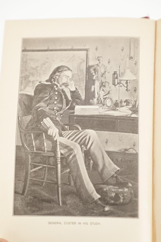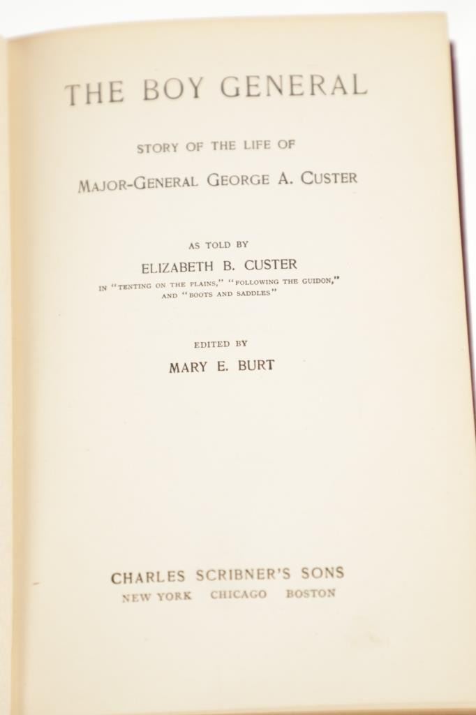 Presented in this lot is a scarse, "The Boy General " by Elizabeth Custer 1st Ed. 1901. Elizabeth B. Custer wrote "The Boy General" to tell the story, in short format, of her life with General George Armstrong Custer. 'Libbie' Custer always thought of her life as a romantic adventure, and her reminiscences, written in various forms, form the basis of the legendary, even mythological, memory of General Custer. But Libbie’s romantic heart and pen does not diminish the value of her story. From the battlefields of Virginia to the Great Plains, she was there, at Custer’s side, and recording her observations. Her account of the Seventh Cavalry’s departure from Fort Lincoln is particularly vivid. She reveals her inner thoughts and concerns while shedding light on her husband's thoughts and actions. According to Mrs. Custer, General Custer was torn between his duty as a soldier and his sympathy for peaceful Indians. Her's is a story of politics, societal mores, personalities and lifestyles of Indians and frontiersmen and the women that followed them, exploration and discovery, long marches, warfare and battles, atrocities, surviving in the extreme climates of the frontier, science, death and a deep and abiding respect and love for General Custer during their life together. "The Boy General" a valuable additional to the body of Custeriana.