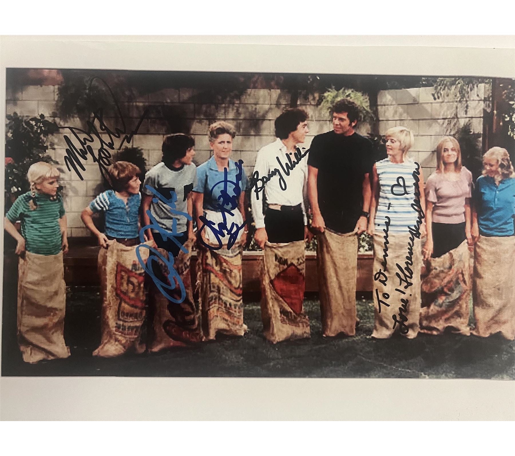 The Brady Bunch cast signed photo autographed by Barry Williams, Florence Henderson, Ann B. Davis, Christopher Knight and Mike Lookinland. 11x8 inches