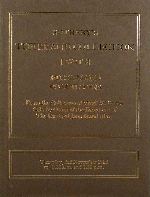 Sotheby's. THE BRAND COLLECTION. [PART 4]: RUSSIAN AND POLISH COINS. London, 3 November, 1983. 8vo, original brown card covers printed in gilt. Prices realized list. Fold to cover; very good or better. With copy of Sale 6 on Dutch coins. A fine sale featuring outstanding Russian coins.
