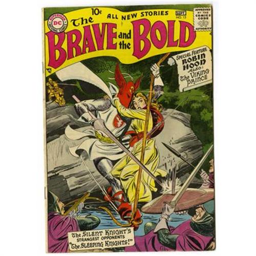 <B>The Brave and the Bold #13 (DC, 1957) Condition: VG/FN.</B></I> Silent Knight, Robin Hood, and Viking Prince appearances. Irv Novick cover and art. Russ Heath and Joe Kubert art. Overstreet 2007 VG 4.0 value = $72; FN 6.0 value = $108.<BR><BR><b>Shipping:</b> Comics - Unslabbed (<a target="_blank" href="http://www.heritageauctions.com/common/shipping.php">view shipping information</a>)