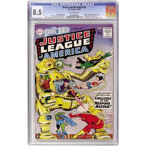 <B>The Brave and the Bold #29 Justice League of America (DC, 1960) CGC VF+ 8.5 Off-white pages.</B></I> You've probably heard the lament of how tough the much-acclaimed #<I>28</B></I> is to find in high grade... well guess what, this second appearance of the Justice League of America is even tougher! While the CGC census for #28 shows six copies graded above 8.5, this issue has just one, so this original-owner copy should be quite popular. The robot cover is by Mike Sekowsky. Overstreet 2006 VF 8.0 value = $1,566; VF/NM 9.0 value = $2,658. CGC census 3/07: 1 in 8.5, 1 higher. <I> From the Warren Hall Collection.</B></I><BR><BR><b>Shipping:</b> Comics - Slabbed (certified) (<a target="_blank" href="http://www.heritageauctions.com/common/shipping.php">view shipping information</a>)