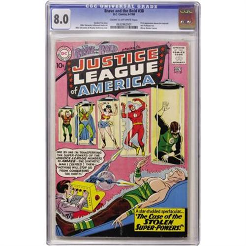<B>The Brave and the Bold #30 Justice League of America (DC, 1960) CGC VF 8.0 Cream to off-white pages.</B></I> This issue would mark the only the third appearance of the Justice League and the first appearances of Amazo the Android and Professor Ivo. The Mirror Master also makes a cameo. Mike Sekowsky and Murphy Anderson cover. Sekowsky and Bernard Sachs art. Overstreet 2007 VF 8.0 value = $1,258. CGC census 6/07: 7 in 8.0, 1 higher. <I>From the Keith Marlow Collection.</B></I><BR><BR><b>Shipping:</b> Comics - Slabbed (certified) (<a target="_blank" href="http://www.heritageauctions.com/common/shipping.php">view shipping information</a>)