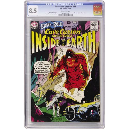 <B>The Brave and the Bold #31 Cave Carson (DC, 1960) CGC VF+ 8.5 Off-white pages.</B></I> "Scarce in high grade" says Overstreet, and here's your proof: just one copy (a 9.0) has received a higher grade from CGC than this specimen. Cave Carson's first appearance is featured here. DC collector extraordinaire Gary Carter once praised the "all time classic cover. We who saw it advertised in other DC books of the time were compelled to nearly terminal curiosity... There's just something magic about that cover!" Bruno Premiani is the artist. Overstreet 2006 VF 8.0 value = $300; VF/NM 9.0 value = $488. CGC census 3/07: 1 in 8.5, 1 higher. <I> From the Warren Hall Collection.</B></I><BR><BR><b>Shipping:</b> Comics - Slabbed (certified) (<a target="_blank" href="http://www.heritageauctions.com/common/shipping.php">view shipping information</a>)