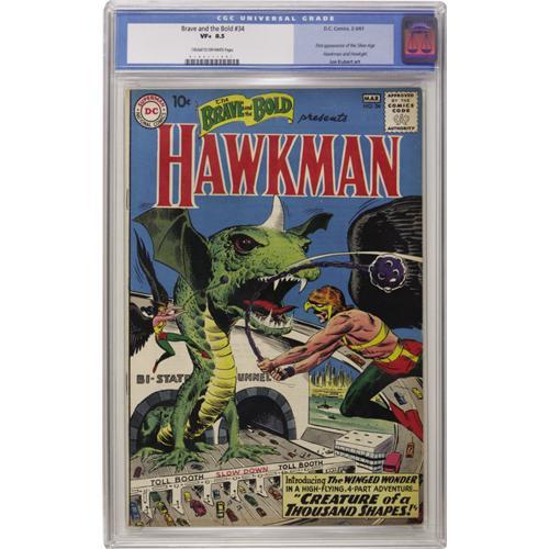 <B>The Brave and the Bold #34 Hawkman (DC, 1961) CGC VF+ 8.5 Cream to off-white pages.</B></I> It's been years since we've seen this key book in such nice condition! In these pages are the origin and first appearance of Silver Age Hawkman and Hawkgirl, with cover and interior art by Joe Kubert. Overstreet 2006 VF 8.0 value = $1,628; VF/NM 9.0 value = $2,764. CGC census 9/06: 3 in 8.5, 13 higher.<BR><BR><b>Shipping:</b> Slabbed Comic (<a target="_blank" href="http://www.heritageauctions.com/common/shipping.php">view shipping information</a>)