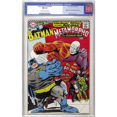 <B>The Brave and the Bold #68 Batman and Metamorpho (DC, 1966) CGC NM 9.4 Off-white to white pages.</B></I> You can always tell the books that are from the height of the Batman craze -- just look at Mike Sekowsky's cover here! Of course, the "Bat-Hulk" bit is a sly jab at Marvel. Comes with a COA from the Cleveland Collection. Overstreet 2006 NM- 9.2 value = $125. CGC census 10/06: 10 in 9.4, 5 higher. <I>From the Cleveland Collection</B></I>.<BR><BR><b>Shipping:</b> Slabbed Comic (<a target="_blank" href="http://www.heritageauctions.com/common/shipping.php">view shipping information</a>)