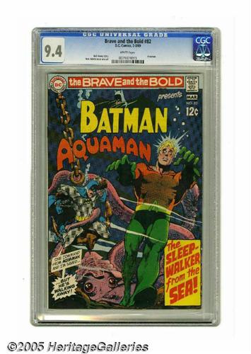 <B>The Brave and the Bold #82 Batman and Aquaman (DC, 1969) CGC NM 9.4 White pages.</B></I> Origin of Ocean Master is retold. Neal Adams cover and art. Overstreet 2005 NM- 9.2 value = $85. CGC census 3/05: 3 in 9.4, 2 higher.