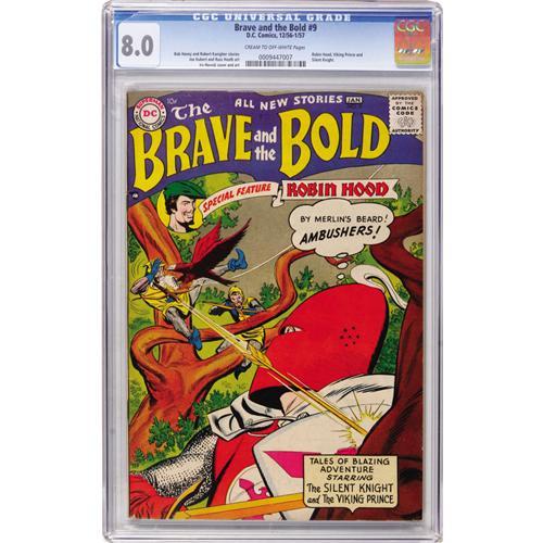 <B>The Brave and the Bold #9 (DC, 1956) CGC VF 8.0 Cream to off-white pages.</B></I> Robin Hood and Silent Knight appearances. Irv Novick cover. Russ Heath art. Viking Prince story by Joe Kubert. Overstreet 2006 VF 8.0 value = $368. CGC census 3/07: 3 in 8.0, 1 higher.<BR><BR><b>Shipping:</b> Comics - Slabbed (certified) (<a target="_blank" href="http://www.heritageauctions.com/common/shipping.php">view shipping information</a>)