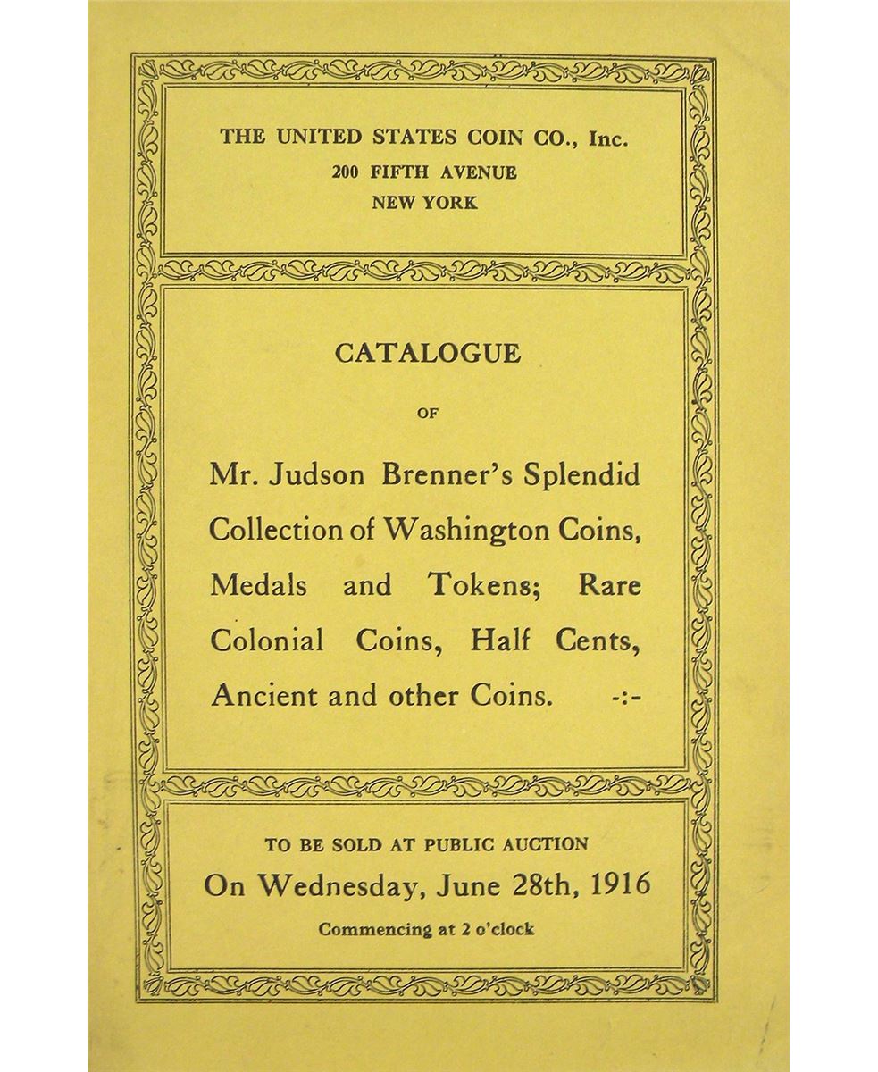 United States Coin Company. CATALOGUE OF THE COLLECTION OF WASHINGTON COINS, MEDALS AND TOKENS FORMED BY MR. JUDSON BRENNER. RARE HALF CENTS INCLUDING CHOICE SPECIMENS OF 1796, 1831, 1836 AND THE RARE 40'S. CHOICE COLONIAL COINS; COINS OF THE KNIGHTS OF MALTA; GREEK, ROMAN, FOREIGN AND OTHER COINS AND MEDALS. New York, June 28, 1916. 8vo, original printed card covers. 26, (2) pages; 504 lots. Near fine. "From E. Gilbert" stamps in a few places. Important for Washingtonia, including a 1792 Roman Head cent, a Washington before Boston medal, a silver Manly medal, a gold oval funeral badge and other rarities. As the title indicates, the sale also included some significant half cents. Adams 33. Ex Kolbe & Fanning Sale 122, lot 1129.