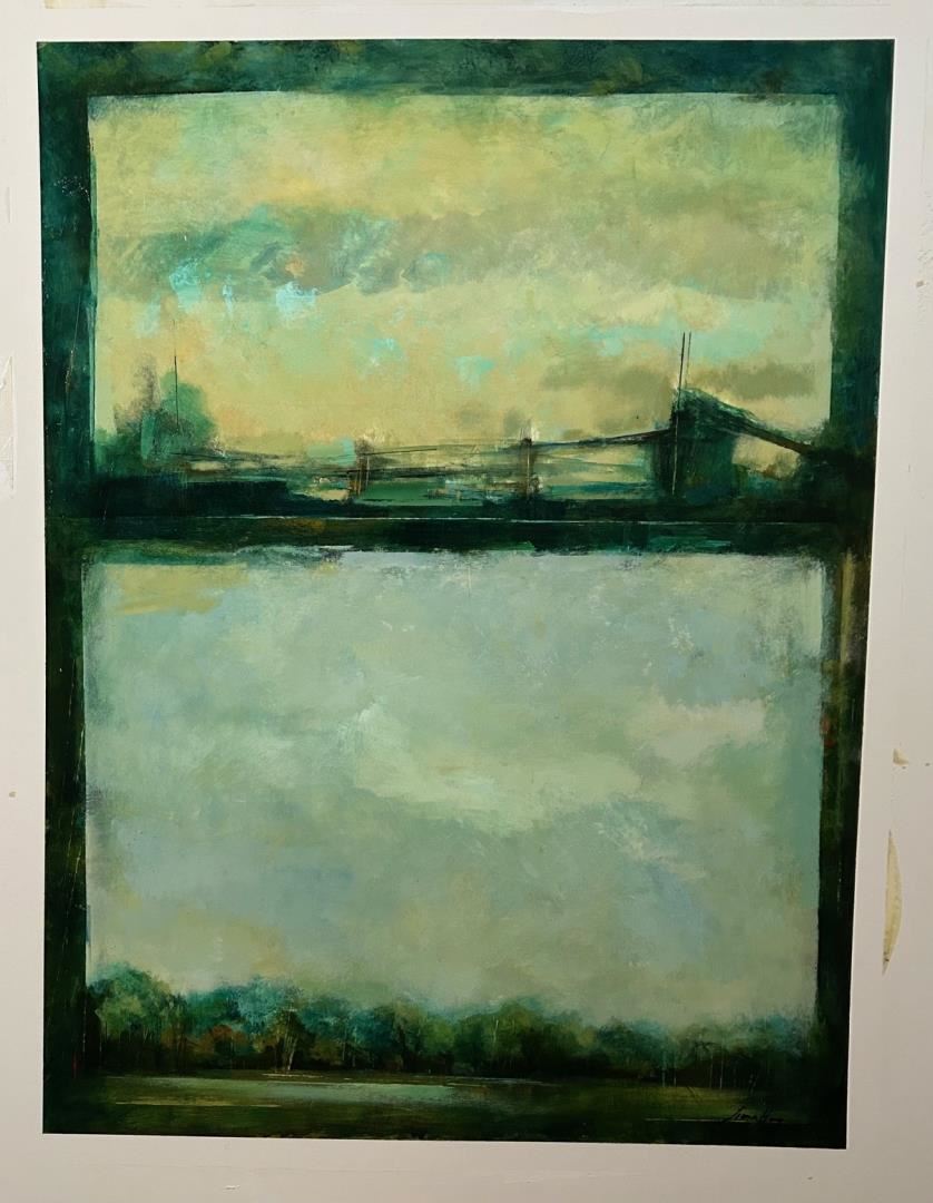 "The Bridge " is a 32x24" oil & encaustic original on board, by Fiona Hoop.