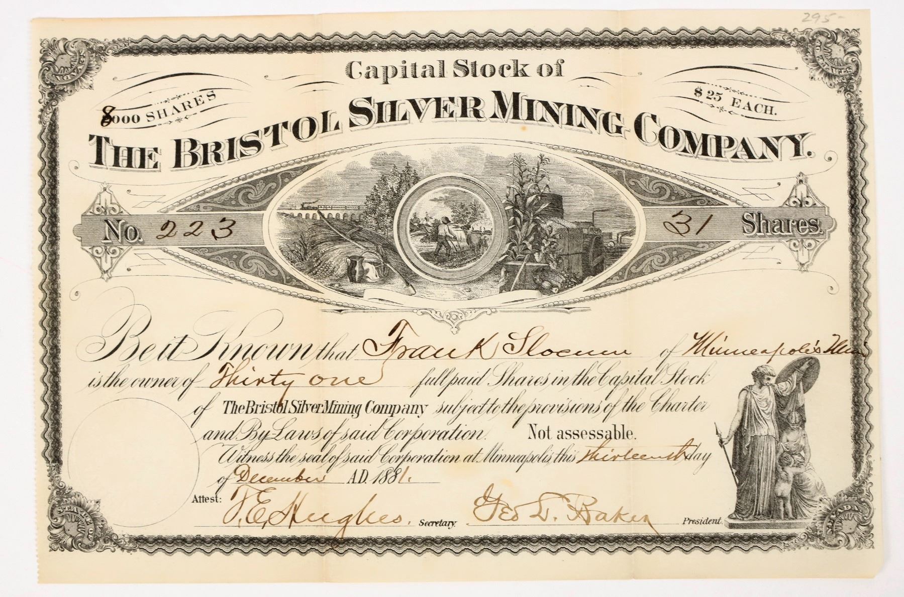 I/U. The Bristol Silver Mining Co. Stock, issue 1881, embossed seal, two vignettes. Center is very complete of farm land, trains, mine and miners. Corners have imprinted "State Of" upper right and lower left, "Nevada" upper left and lower right. Except for tri-folds in excellent cond.