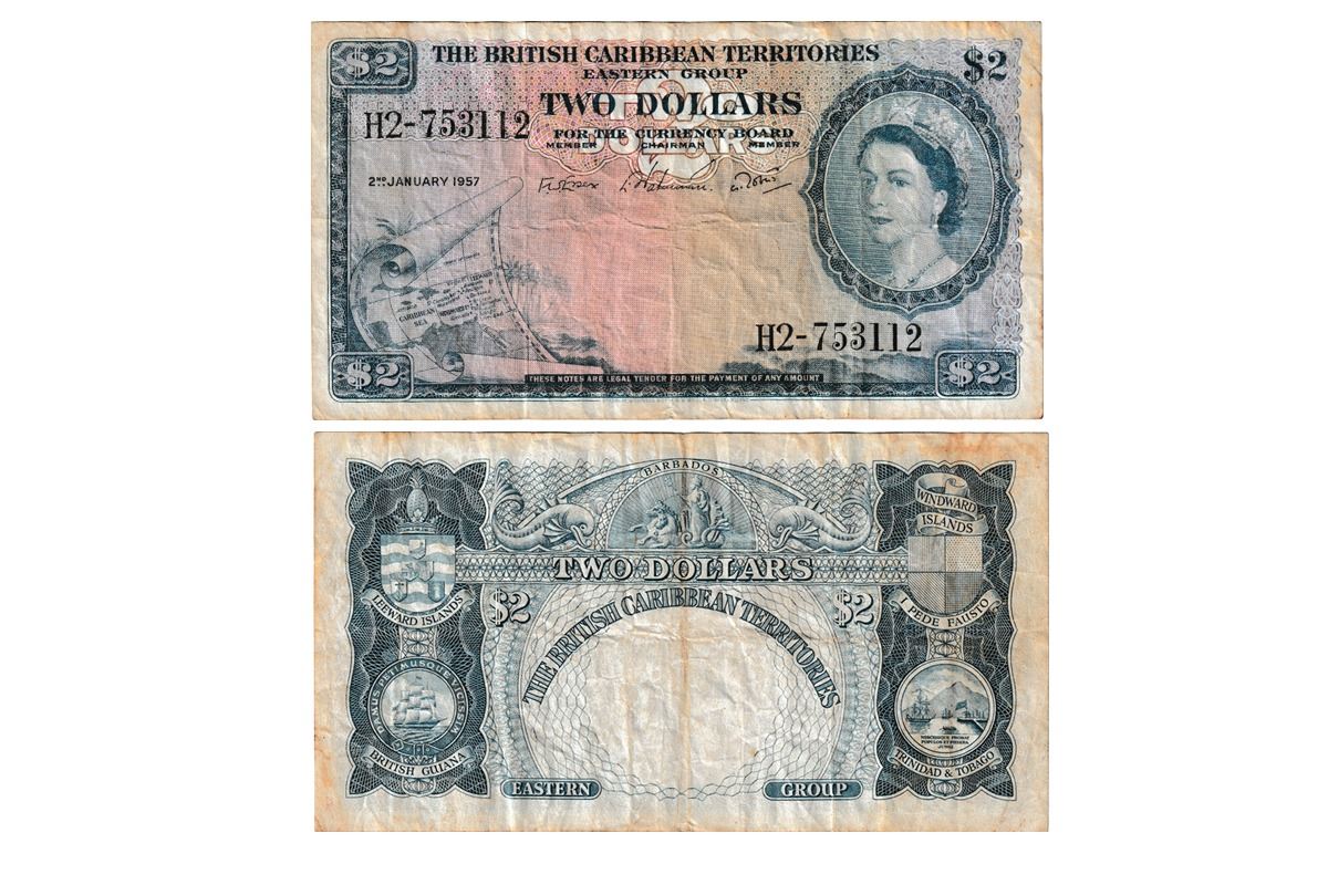 The British Caribbean territories, Eastern Group, Two Dollars, Portrait of Young Queen Elizabeth II Signed by 2 members and a chairman of the currency board on 2nd January 1957 on the front, Coat of arms with names of Leeward Island, British Guiana, Barbados, Windward Island, and Trinidad & Tobago Island on the back, VF+.