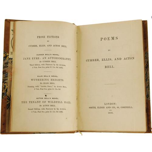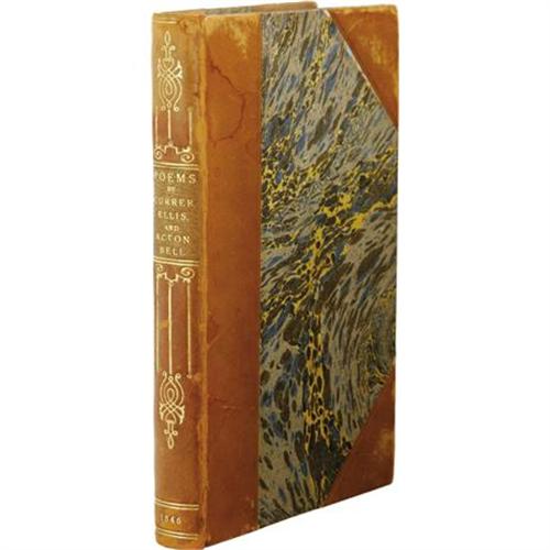 <B>Currer, Ellis, and Acton Bell pseudo. Charlotte, Emily, and Anne Bronte :<I> Poems.</B></I></B></I> (London: Smith, Elder and Company, 1846 1848 ), first edition, second state, 165 pages, old rebind in half calf binding with marbled boards by Anker Kyster, gilt titles and decoration, floral patterned endpapers, segments of original green cloth binding including spine bound in back, 16mo (4.5" x 6.75"), lacking tipped-in errata slip at front and 16-page publisher's catalog at rear, minor wear and light scuffing, text lightly tones, two small bookplates on the inside front cover, else very good condition. The initial print run was for 1,000 copies, initially with the title page imprint of Aylott and Jones. Virtually no copies sold and the remaining copies were sold to Smith, Elder and Company who reissued them a few years later with new covers and title page.<BR><BR><b>Shipping:</b> Books & Catalogs (<a target="_blank" href="http://www.heritageauctions.com/common/shipping.php">view shipping information</a>)