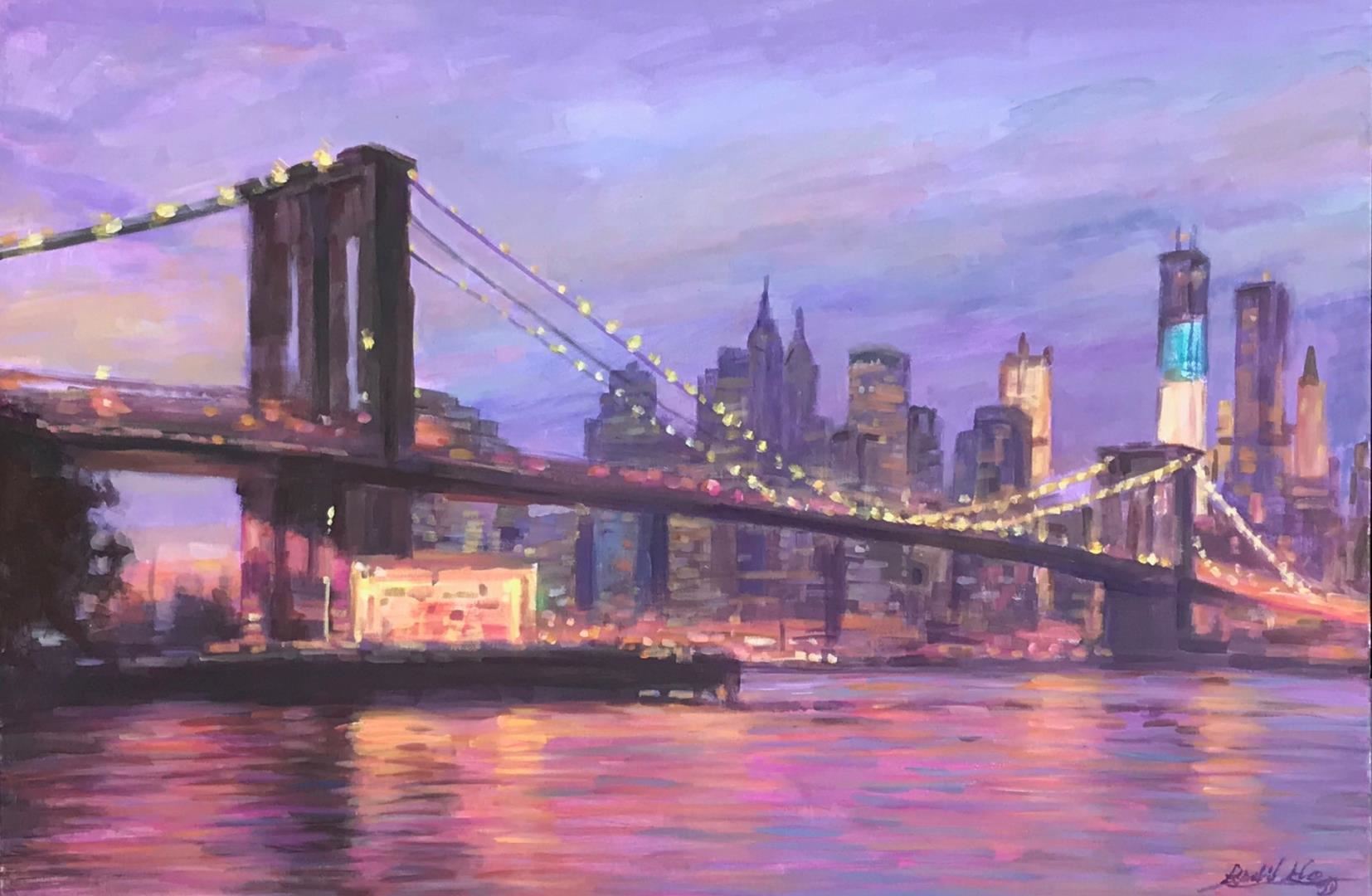 A perfect dramatization of the Brooklyn Bridge lit up at night. An original 24x36"original acrylic by Richard Ho, on stretched canvas w/COA.