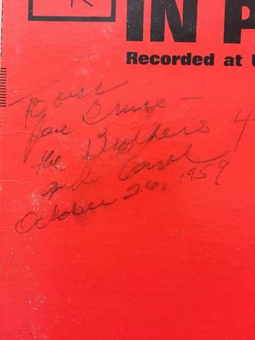 Autographed album cover of "The Brothers Four: In Person", released in 1962. Recorded at the U.S. Naval Academy in Annapolis, as well as Vanderbilt University, this is one of the early albums in their career (#6) having only recorded for a couple of years at this point.