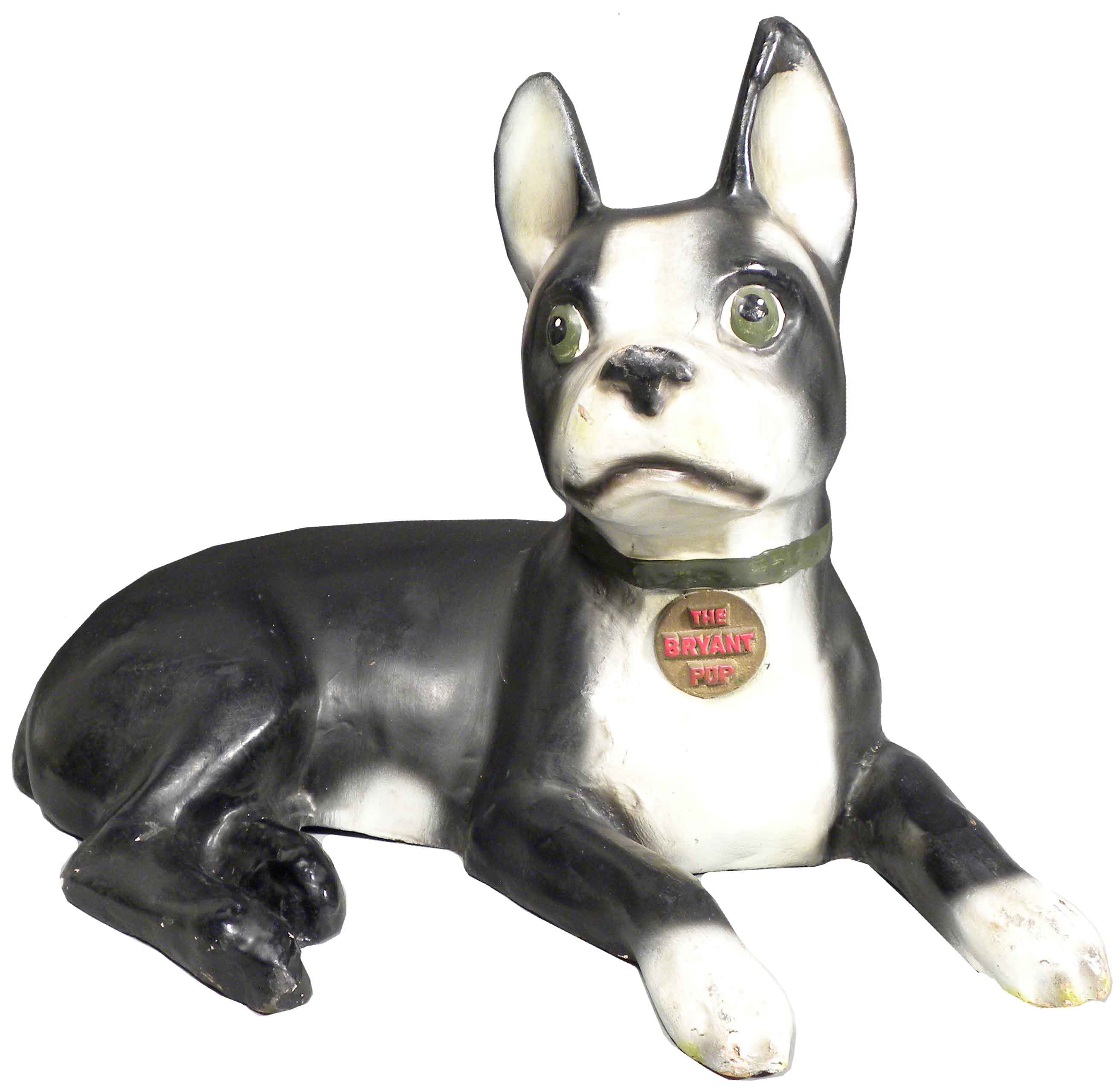 The Bryant Pup Paper Mache Display Dog. Old King Cole Displays, Canton, OH. Mfgs. Excellent condition. 17 1/2 X 13 X 13 inches.