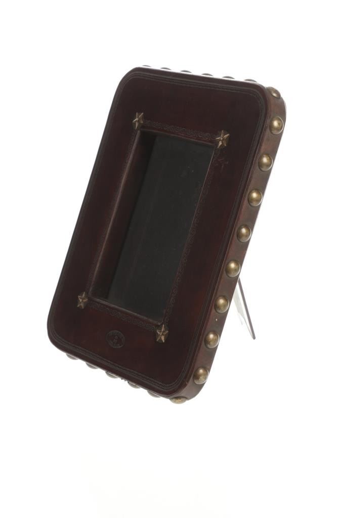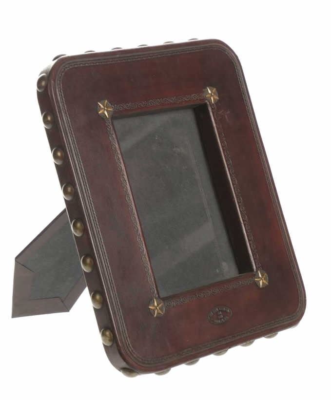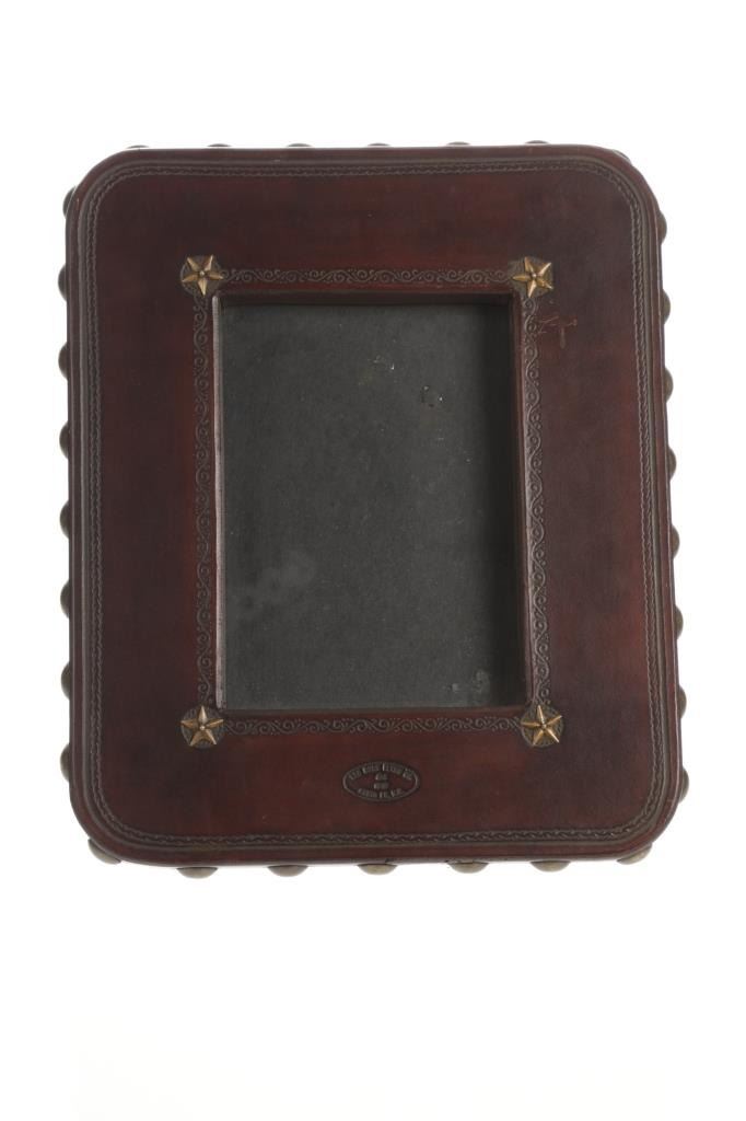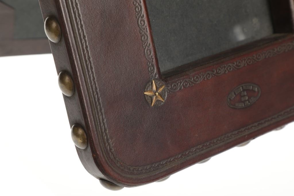 Featured in this lot is this leather wrapped picture frame from The Buck Flynn Co. The picture frame features a wonderfully and professionally crafted leather wrapped construction with a studded rim and shows western tooling in between bronze stars. The condition of this leather wrapped frame is good with a slight scuff mark in the upper right hand corner but otherwise is in good overall condition. The measurements of this frame are 11 3/4" x 9 3/4".
